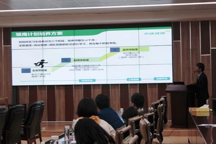 实习基地单位代表、宁波美康生物科技股份有限公司戎奇吉就实习管理工作做了题为“雏鹰计划”实习生培养项目的汇报。他从雏鹰计划的简介、实施、实验室专业组轮岗学习安排、实习生综合管理等四个方面介绍公司的实习管理工作经验。戎奇吉对必赢bwin线路检测中心重视学生实习工作表示充分肯定,对必赢bwin线路检测中心学生在实习中表现出的良好技术素养、积极求学精神以及良好纪律作风予以表扬。